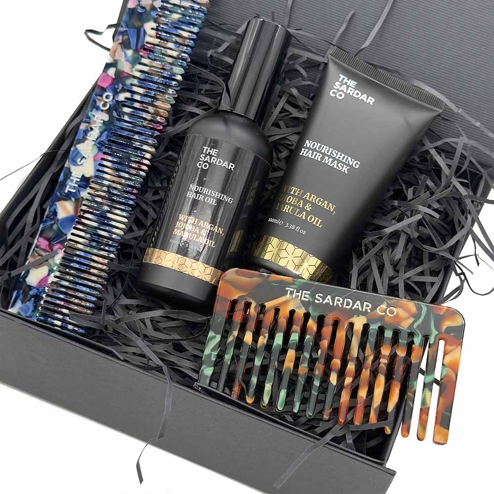 This luxurious Hair Care Gift Set is the perfect treat, featuring a nourishing hair oil, a revitalizing hair mask, and an acetate hair comb and detangler, all in an eco-friendly package. Get ready to pamper your hair with the good stuff – all the ingredients your locks need to stay healthy, luscious, and looking fabulous!